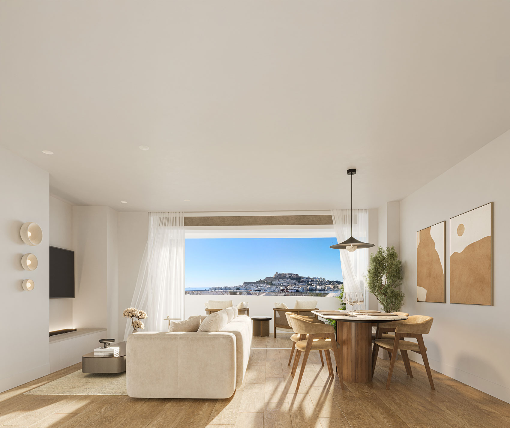 Each penthouse features private terraces that open out to both the sea and the mountains, offering an unparalleled panorama of Ibiza in all its beauty, from the first light of sunrise over the water to the final glow of sunset behind the hills.
